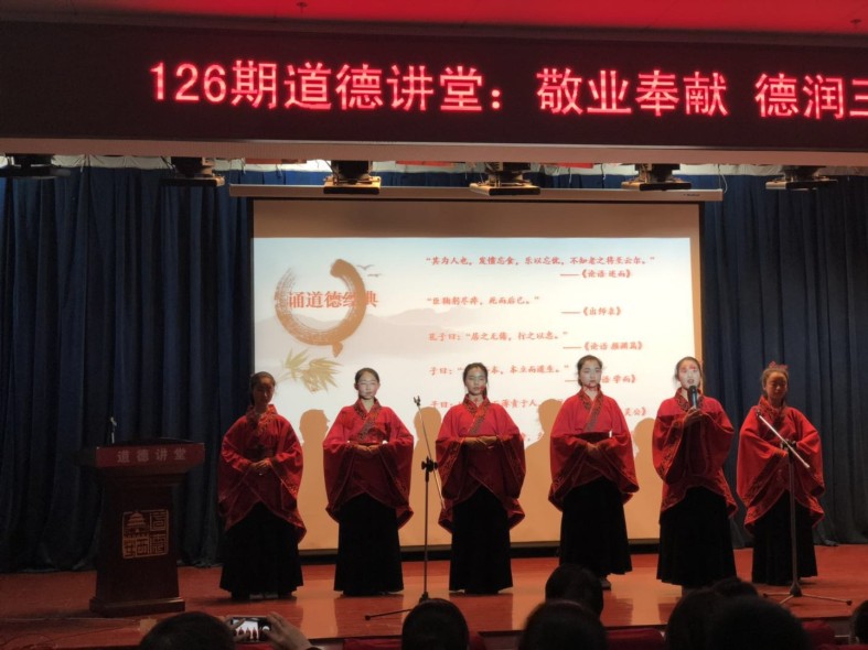 “其為人也,發(fā)憤忘食,樂以忘憂,不知老之將至云爾”,“臣鞠躬盡瘁,死而后已”學生代表朗誦的道德經典也再次說明愛崗敬業(yè)精神從古至今一直為人們所崇尚。