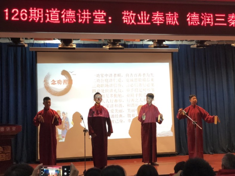 此次講堂共有五個環(huán)節(jié),圍繞“敬業(yè)奉獻,德潤三秦”,這一主題,以唱《公民道德歌》、講道德故事、誦道德經典、念勸善詞、做道德承諾等形式開展。每個環(huán)節(jié)的內容都豐富多彩,引人深省,讓大家受益匪淺。